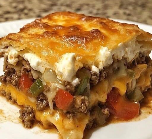 It’s a warm, oven-baked dish built in layers—starting with a soft biscuit base, topped with taco-seasoned ground beef, diced tomatoes with green chilies, and onions. That’s followed by a creamy mixture of sour cream, mayo, and cheddar cheese, then finished with more melty cheese on top. This dish is a hit at potlucks, family dinners, or anytime comfort food is calling.