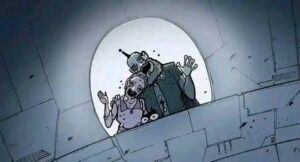 He forces her into the abduction beam while he stays safely on the ground, waving goodbye with a huge smile. The mother, clutching her little suitcase, is lifted into the sky, crying and reaching for him. He thinks he’s free at last.