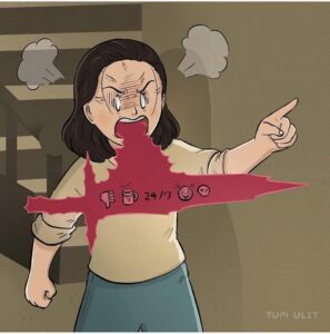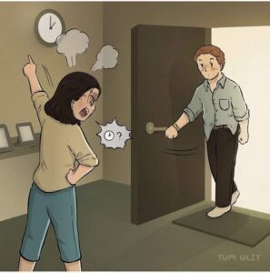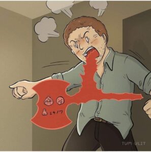 Behind closed doors we see him screaming at his own partner with the exact same red rage-axe, the same 24/7 anger icons floating around it.