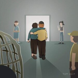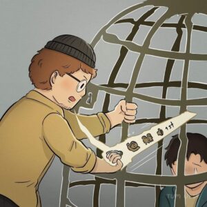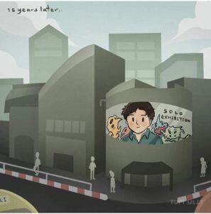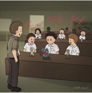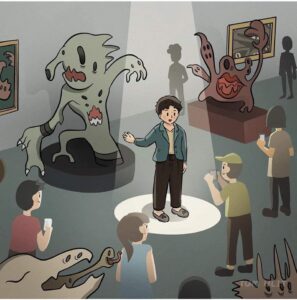 He has turned the trauma into “art.” The crowd admires the grotesque creatures he once drew to process his fear.