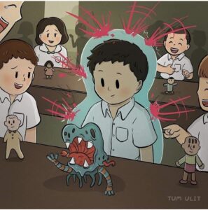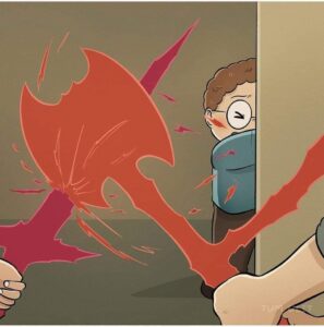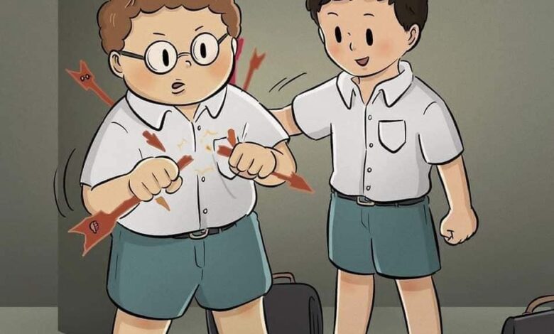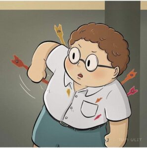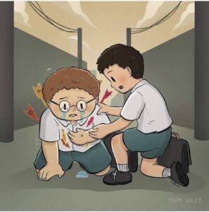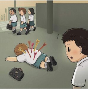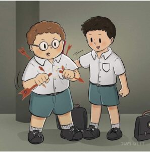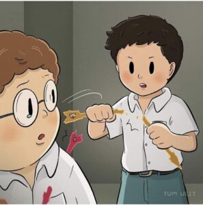 He begins turning the pain outward: he bullies weaker kids at school, stabs classmates with the same red arrows that once wounded him, and even lashes out physically.
