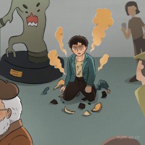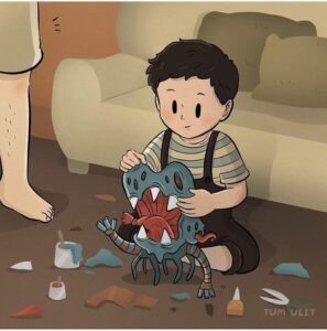 Years later we see the same boy, now grown, having his own child-self’s monster sculptures exhibited in a prestigious gallery.