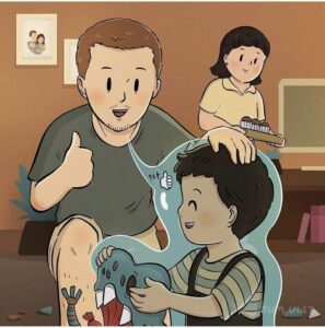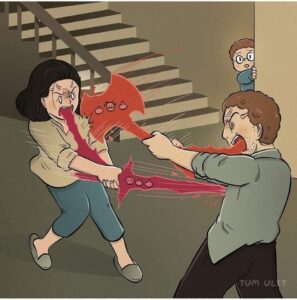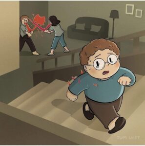 A little boy (curly-haired, chubby, wears glassesis constantly exposed to his parents’ explosive, toxic fights.