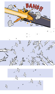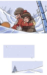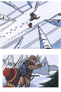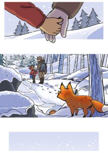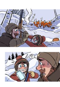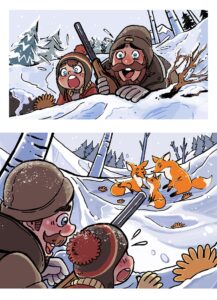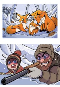 But the dad deliberately fires into the air (“BANG!!”), scaring the foxes so they run away safely. Birds scatter from the trees.