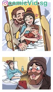 Cut to later: The dad is showing his wife (who’s recovering in the hospital) a photo on his phone of him and their daughter happily hugging a giant red fox plush toy (or possibly a real rescued fox kit — the comic leaves it ambiguous). The caption says “Best Mum” with hearts. The wife is smiling in the hospital bed, and the dad is overjoyed.