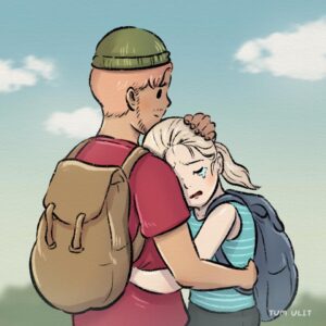 6β10. They continue their separate adventures: hugging on a cliff, facing a bear together (waitβno, theyβre apart again), getting injured, helping strangers, climbing icy peaks alone, saying goodbye to new friends, getting lost, arguing at night, bandaging wounds, sheltering from storms in a tent, reaching out for a hand that isnβt there, etc. Their paths are completely different β one high and cold, one warm and tropical β full of hardship, joy, loneliness, and growth.