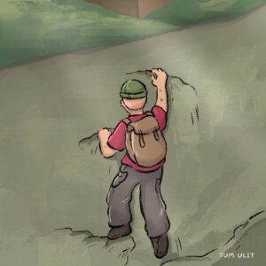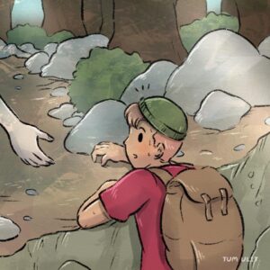 A lone hiker (the boy) walks through a dark forest, then struggles alone up a steep cliff, finally emerging into the light with a happy, relieved face.